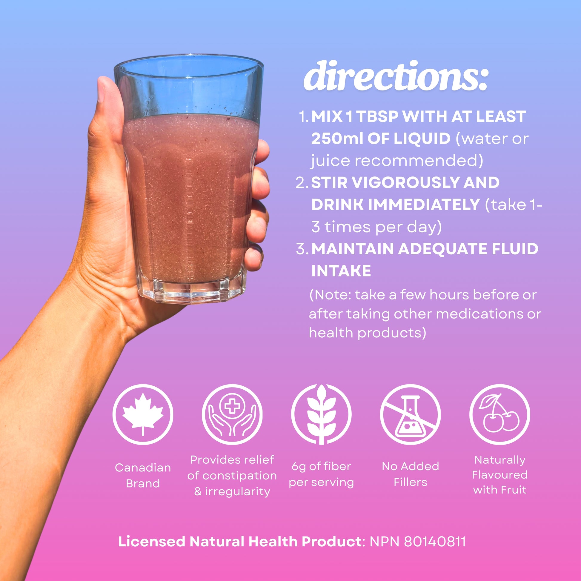 No fillers, no sugars, just the good stuff with a whisper of fruit powders. A mix of psyllium husk powder + psyllium whole husks + some dried cherries and raspberries pummelled to a dust.
