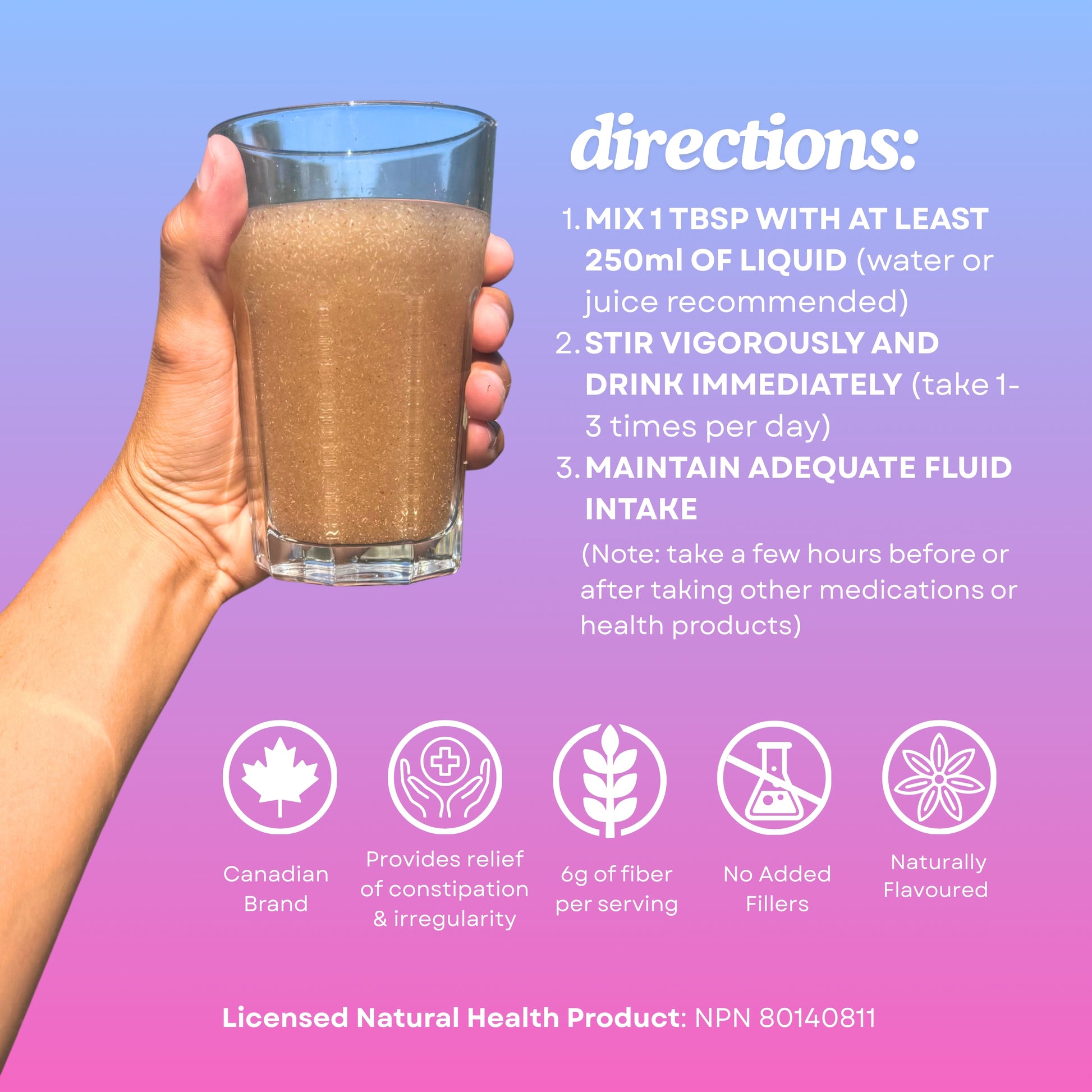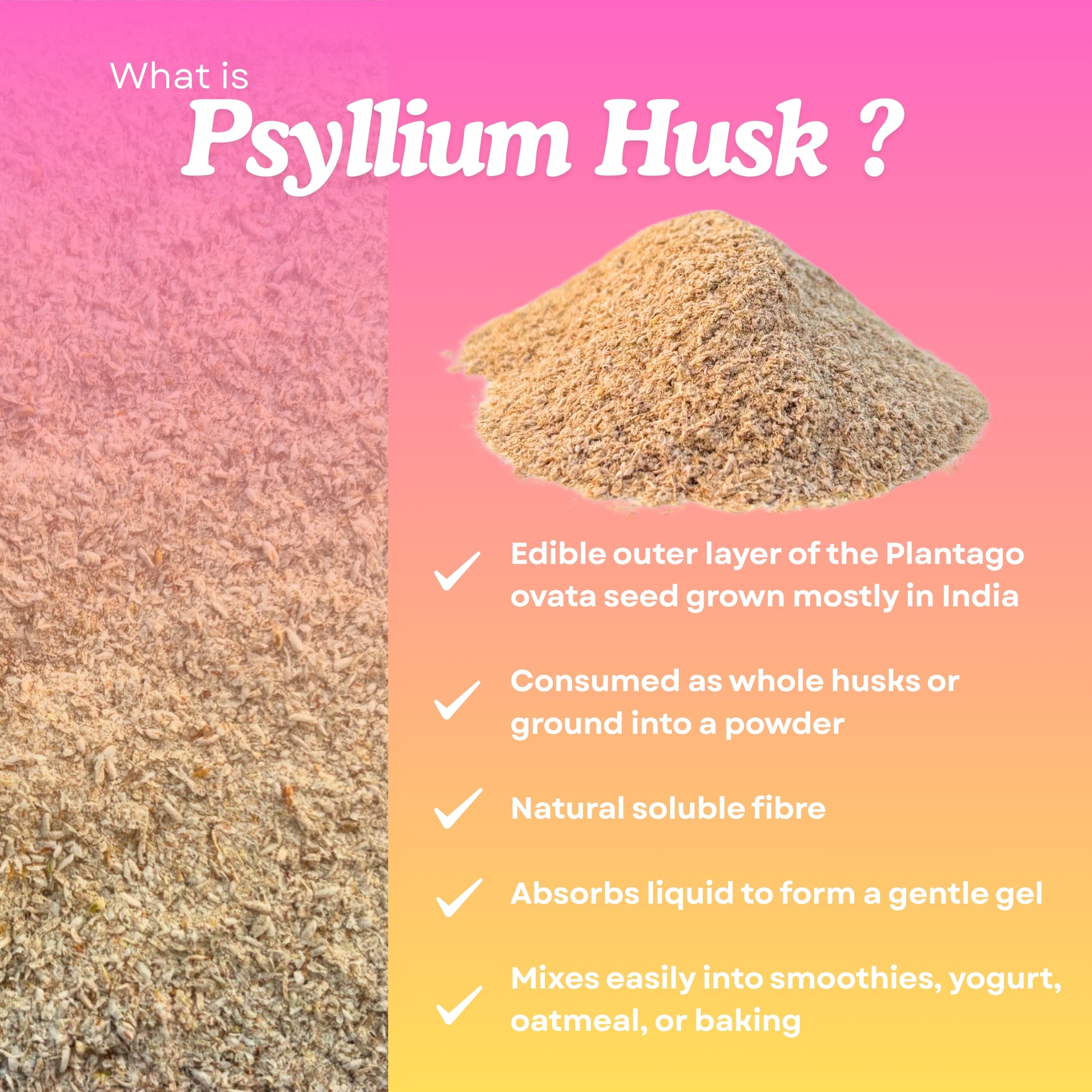 No fillers, no flavours, just the good stuff. A mix of psyllium husk powder + psyllium whole husks.
